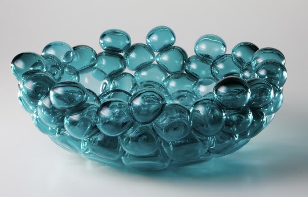 A decorative bowl made of blue glass bubbles stacked together.