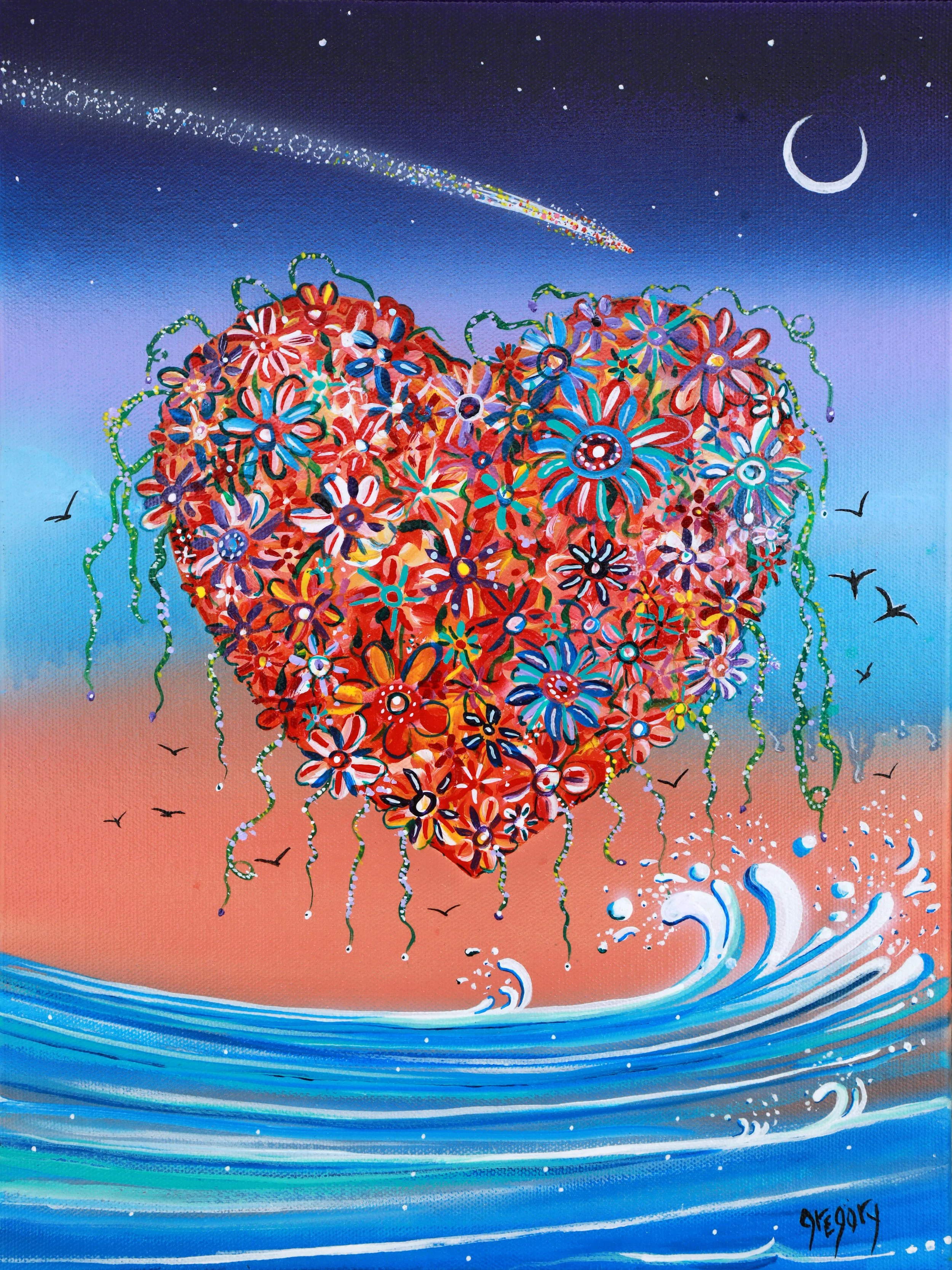 A heart-shaped cluster of colorful, stylized flowers floating above blue water, with a gradient sky background featuring a crescent moon, birds, and a shooting star.