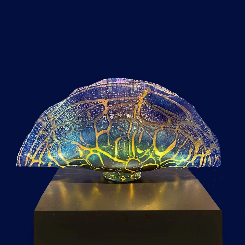Glass art piece resembling a illuminated shell with intricate, web-like patterns, displayed on a pedestal with a dark background.
