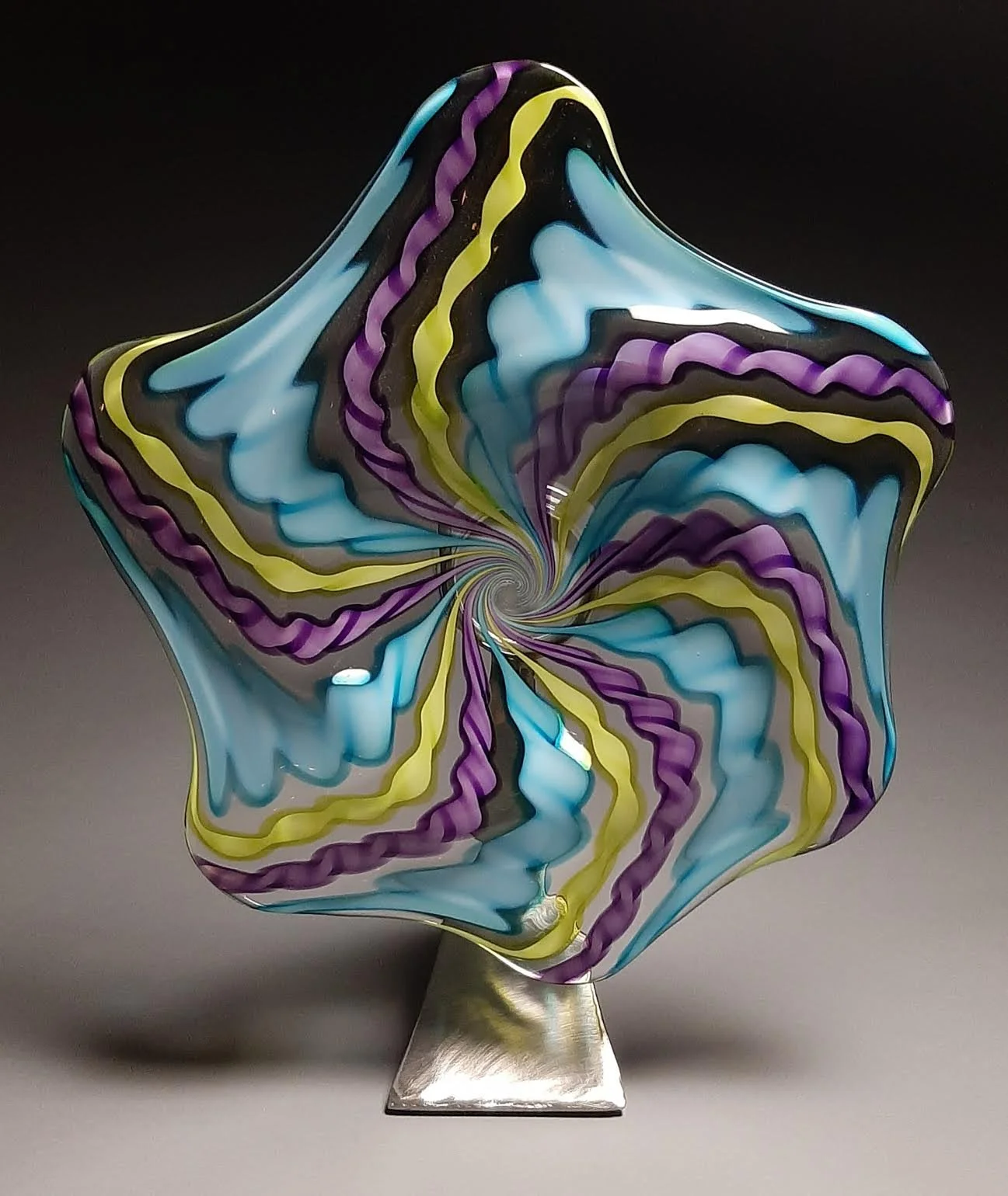 Colorful glass art sculpture with swirling patterns in blue, yellow, green, purple, and orange hues on a silver base