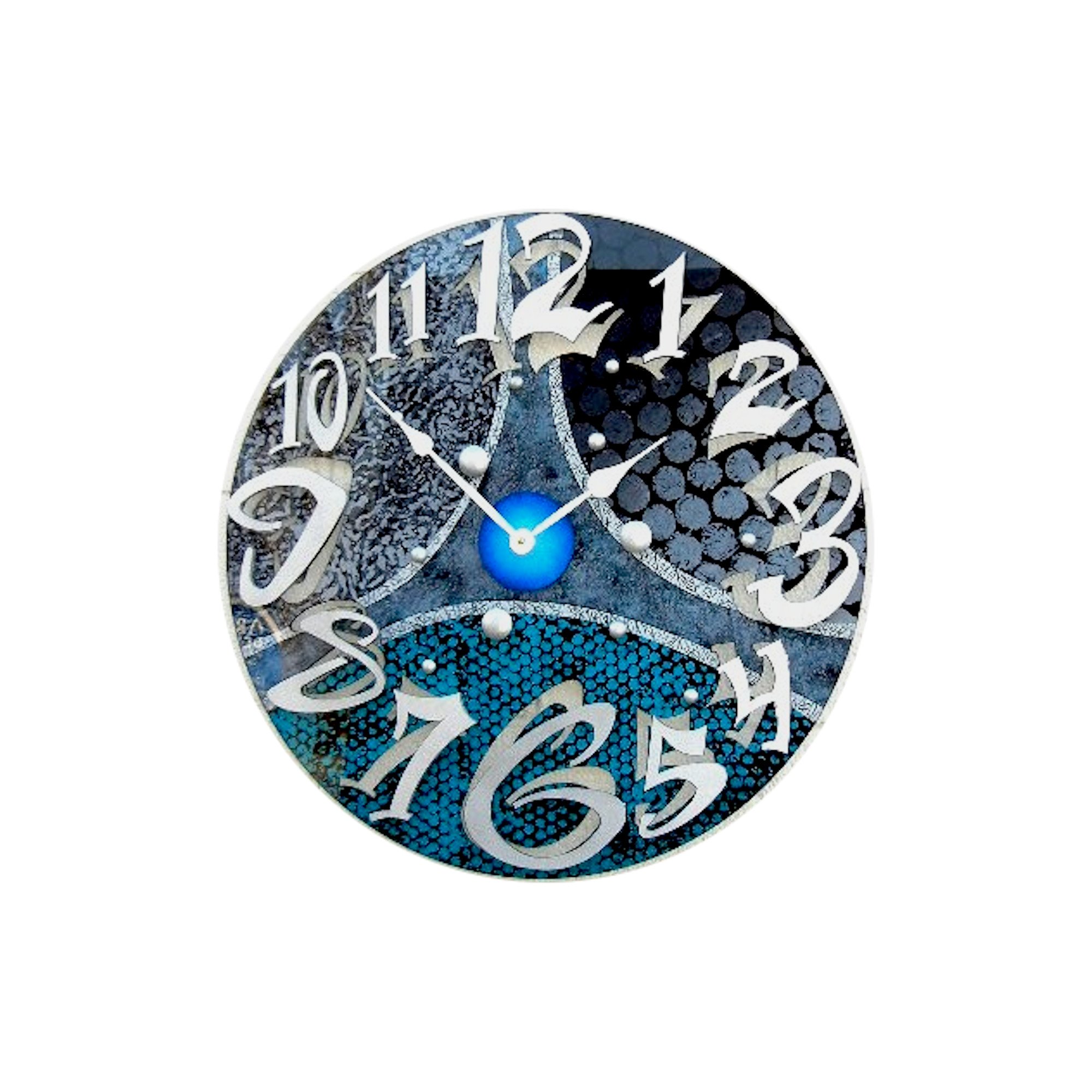 Colorful abstract clock with a patterned green circular face, large playful white numerals, and stylized blue and purple geometric base, on a white background.