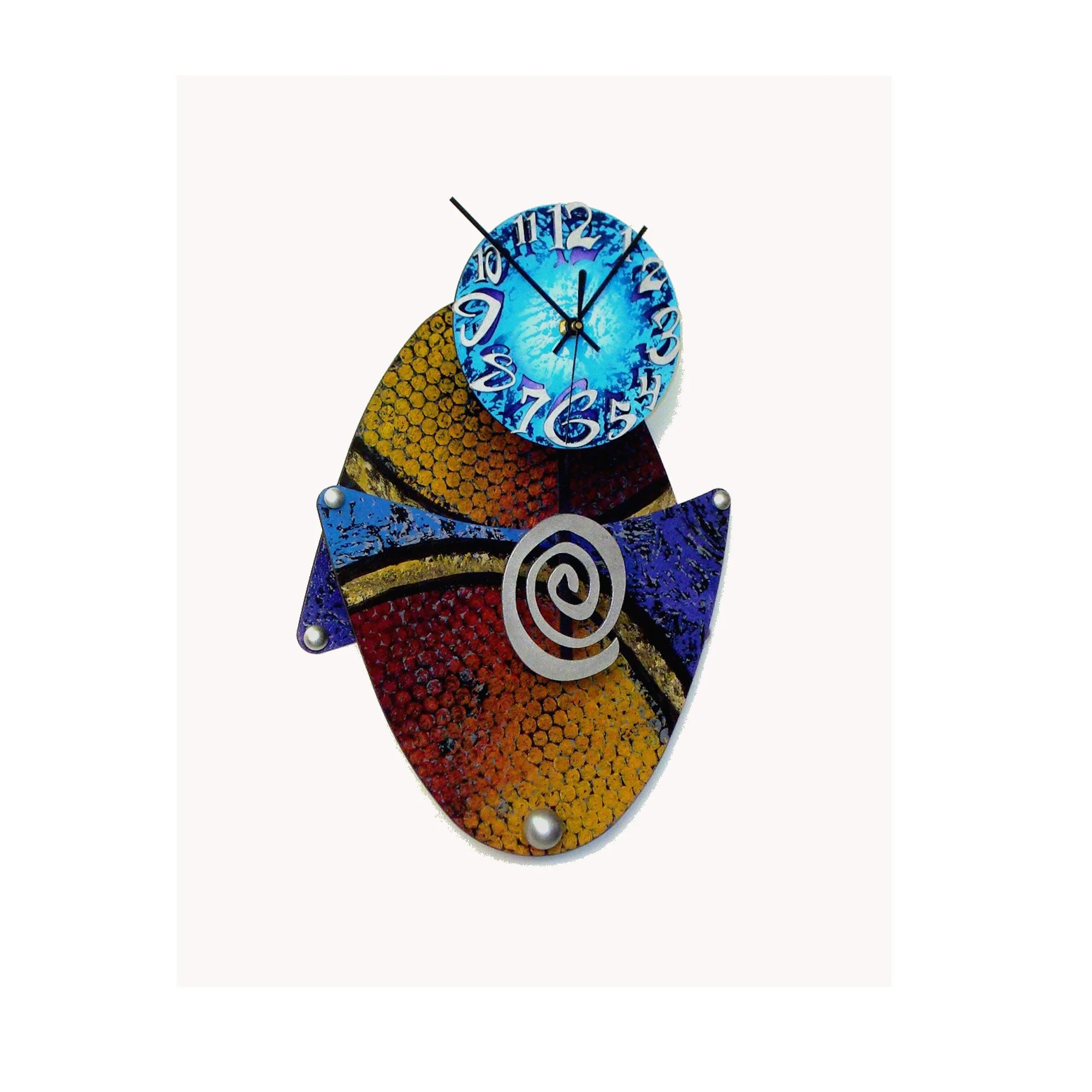 Colorful wall clock with a predominantly blue background, multicolored numbers, and a pendulum at the bottom.