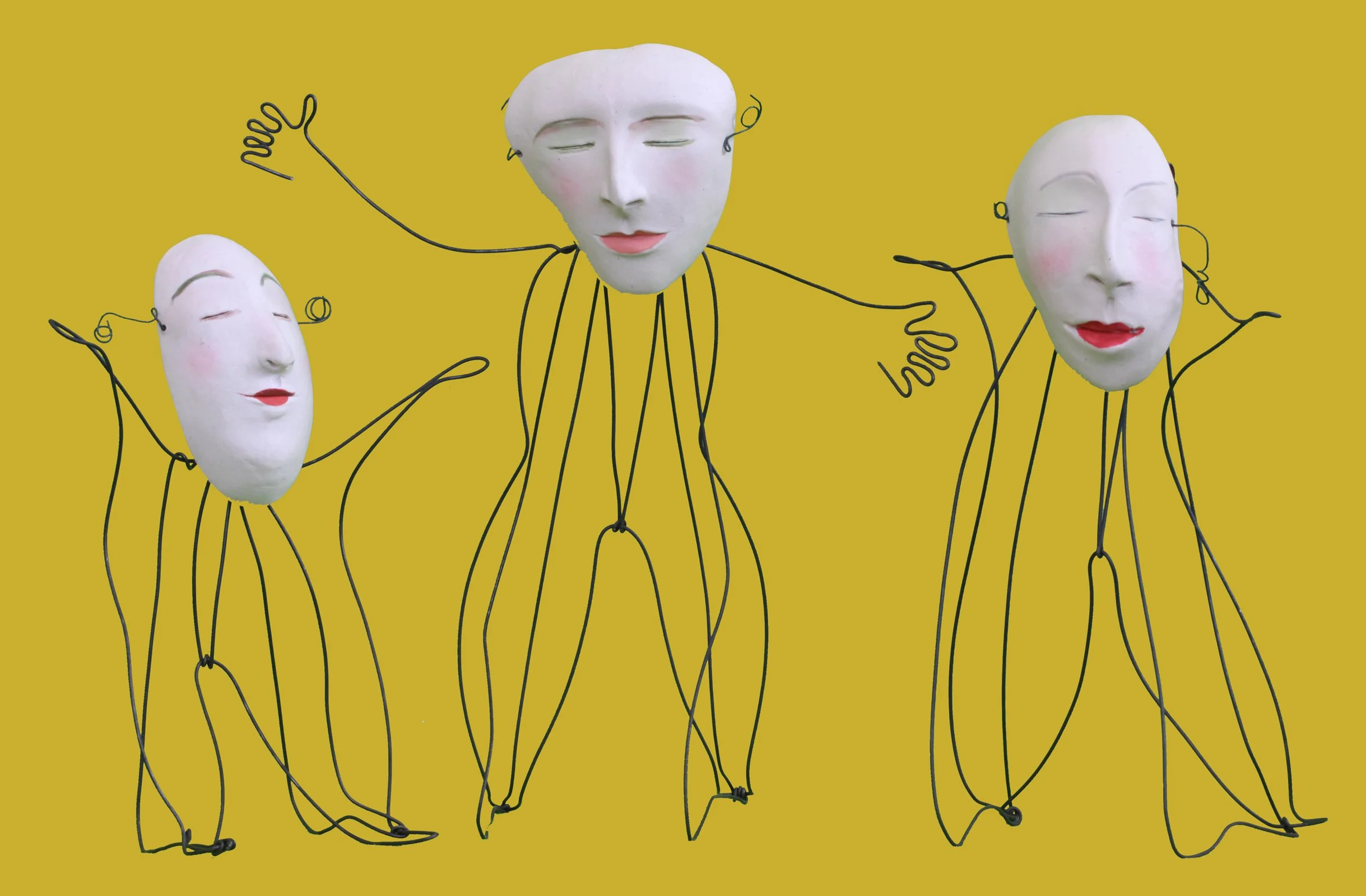 A sculpture of a stylized, abstract female face with a blend of metallic and wooden textures, featuring prominent almond-shaped eyes and a delicate, curved mouth.