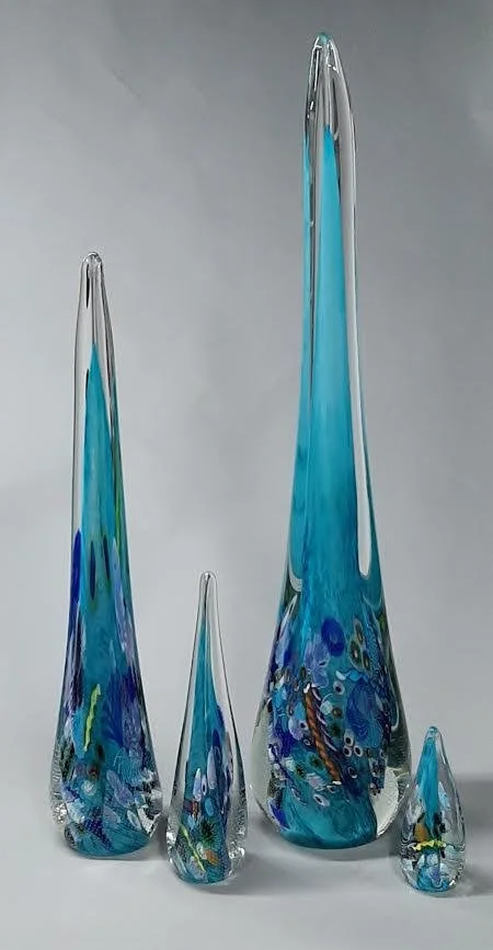 Set of five multicolored glass sculptures with elongated, tapered shapes, featuring blue, green, yellow, and black accents, arranged from smallest to largest, against a neutral background.
