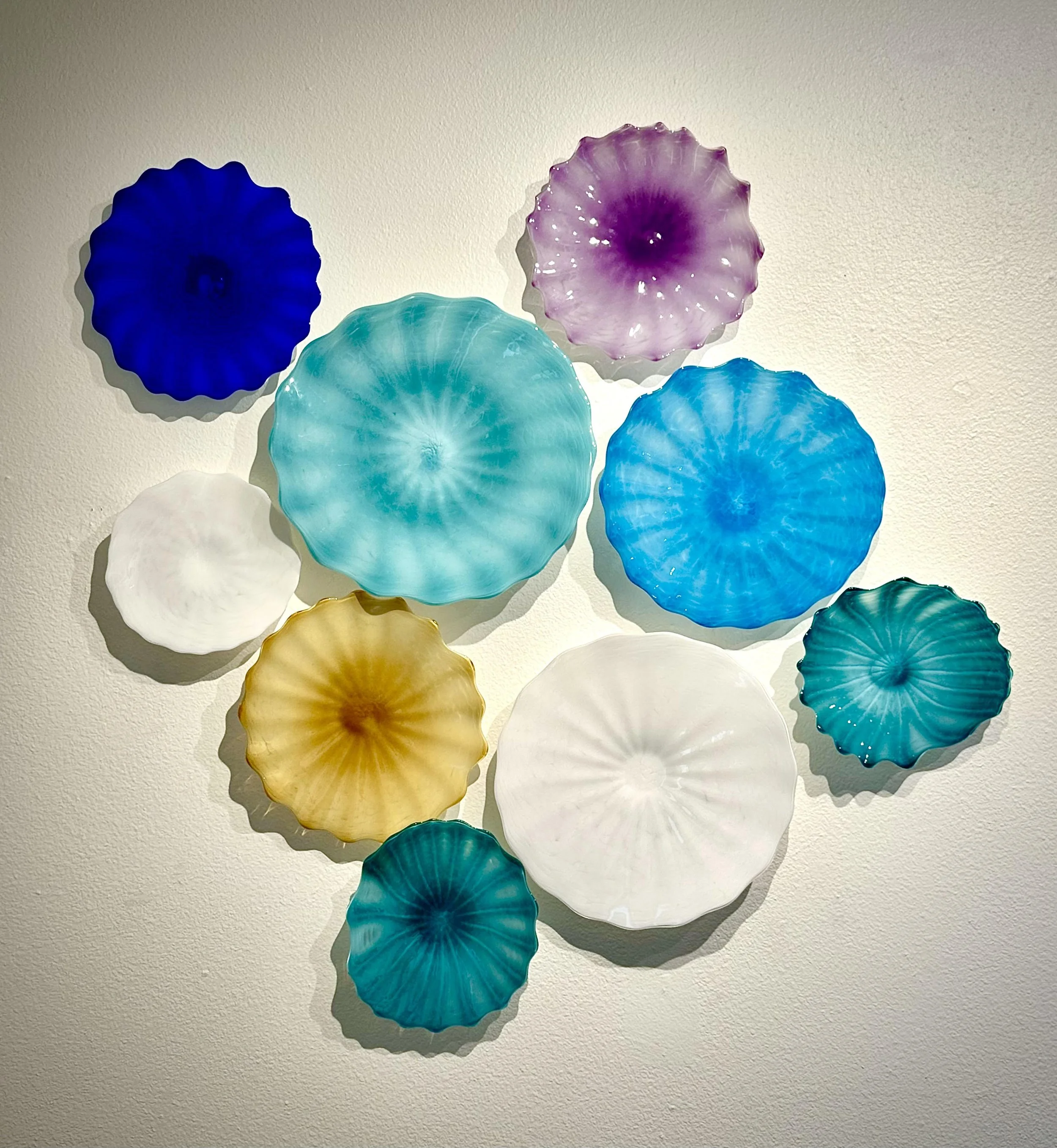 Colorful glass wall art consisting of round, shell-shaped pieces in blue, purple, yellow, white, and turquoise arranged on a white wall.
