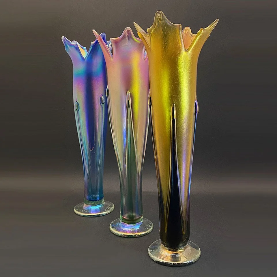 Three tall iridescent glass vases with ruffled tops, arranged in a row against a dark background. The first vase on the left is blue, the middle is pink and green, and the right is yellow and black.