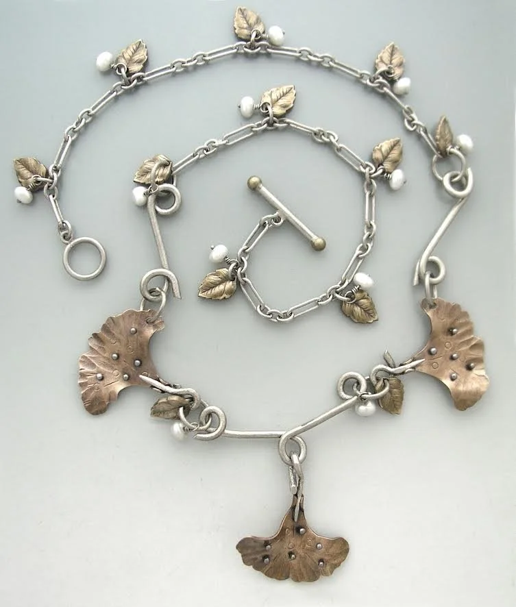 A layered necklace with silver chains, decorative leaves, pearl accents, and ginkgo leaf pendants.